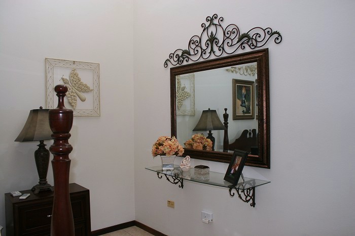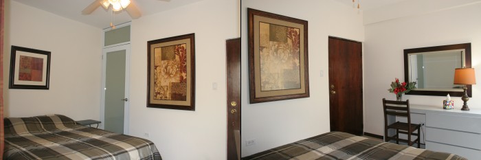 The decoration of this room is more modern. The bed is Queen size and there is a computer desk at right (not shown) with speakers. Both this and the previous room have ample closets and built in drawers. There are also big mirrors in all rooms.