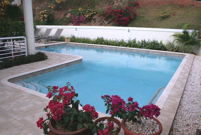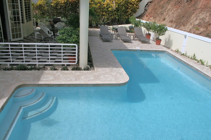 The pool is just fantastic! It measures 27' X 12' in one leg and 24' X 12' in the other, for a total of 39' X 12'. It goes from 3' to a maximum depth of 5'. It has plenty of sitting area in the shallow portion and in the afternoons this part is mostly shaded.