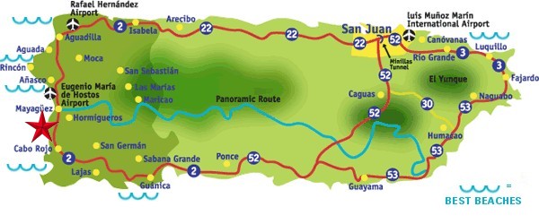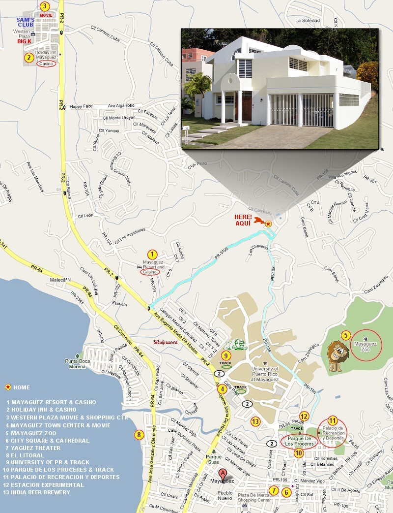 The house is located in the spot marked by the yellow circle with the red star, at the end of PR-3108 (painted in blue). As you can see, it is very easy to get there directly from highway PR-2 (this is the main highway that goes around most of the island), and from there you can easily reach most of the most important places in the west. The tourist spots in other cities are also easily accesed through PR-2.