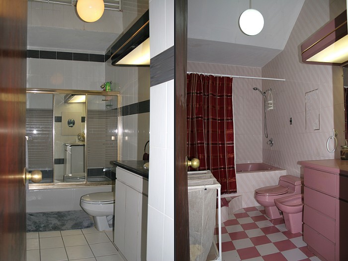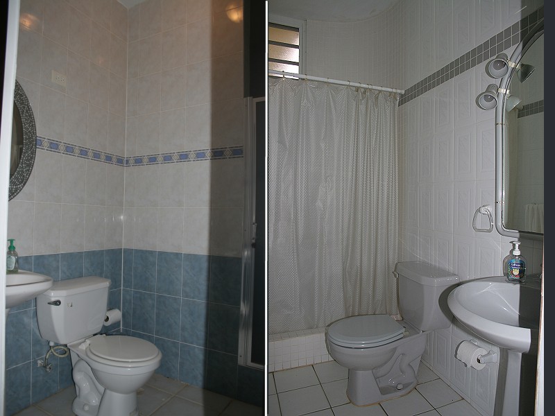 These are the bathroom in the hall and in the Master room, respectively. Both have bathtubs, the Master room's one being a jacuzzi for two. We provide soap, toilet paper, shampoo and conditioner, and good quality towels for every guest.