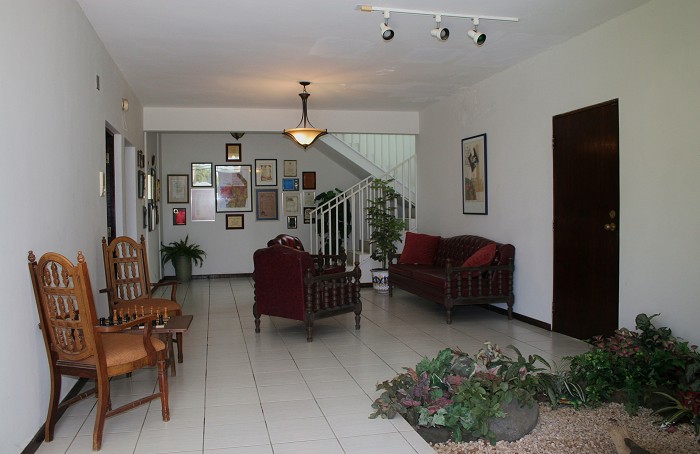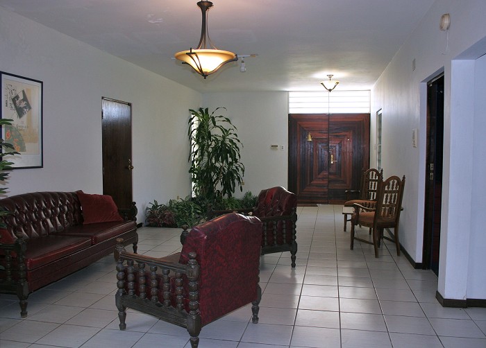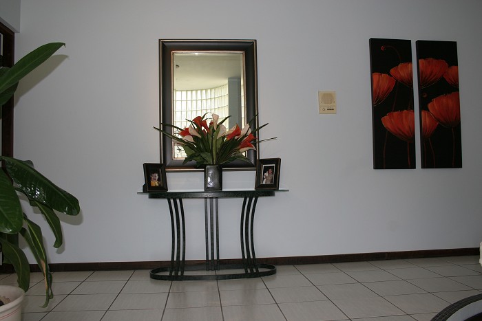 Another view of the foyer, now looking toward the main entrance. You can now see the interior garden and the spaciousness of this part of the house. Again, the door at left leads to the carport and to the gym, and to the right you can see the media room's door and the hall that leads to the guest room and the lower level's bathroom.