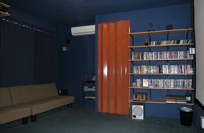General view of the media room. All the movie collection of over 200 movies is available for your enjoyment. We have replaced the futtons shown with a full size bunk bed that can sleep up to four persons. The folding door is a lighted closet for your clothing.  This will certainly be one of the favorite roomss because it is the darkest, day and night! We provide good quality linens, pillows and covers for all the rooms.