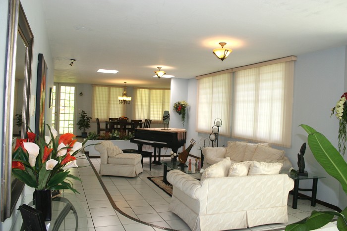 View of the ample and beautifully decorated living room and formal dinning room, where you'll feel like a king/queen. The door leads to the covered terrace that you'll see later. The baby grand piano is available for use by people with musical knowledge, if there is any in your group, for hours of fun and enjoyment.