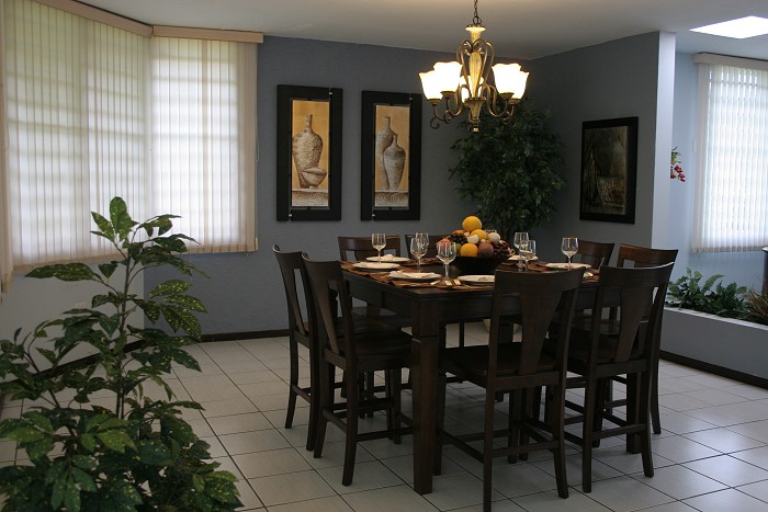 The nice formal dinning room comfortably seats eight persons. All the dinnnerware is provided.