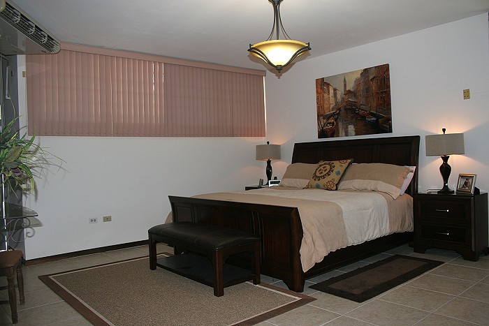 The master room is really a 300 square foot suite (28 sq. mts.) with a spacious King size bed with its two night tables and a bench at the bed's foot. It also has a full size walk-in closet with drawers and a home office area with a desk with a DELL computer we provide, or bring your own laptop and connect wirelessly to high speed internet. This room has a walk-in closet, its own private bathroom with a big and nice jacuzzi, and connects with the open terrace where you can sit and enjoy at nights.